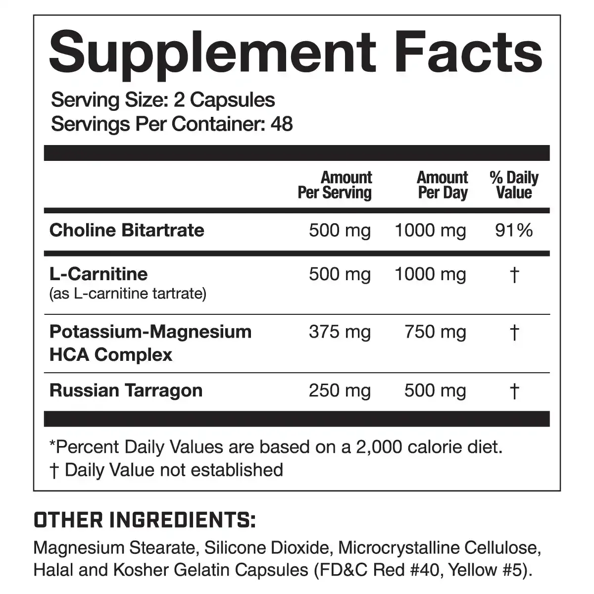 - ترکیبات طبیعی و مؤثر مانند ترخون روسی، کولین بیتارترات و HCA