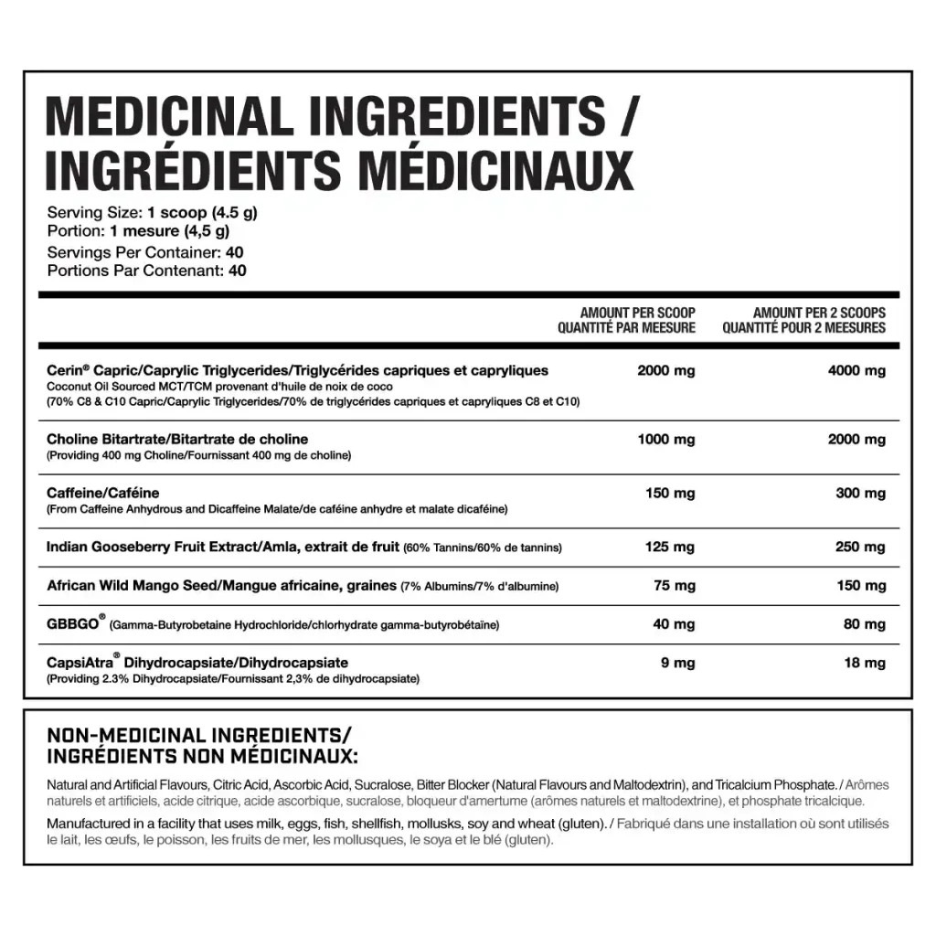 منبعی غنی از اسیدهای چرب با زنجیره متوسط که به سرعت به انرژی تبدیل شده و تولید کتونها را افزایش میدهد. - کولین بیتارترات (Choline Bitartrate) – ۱ گرم